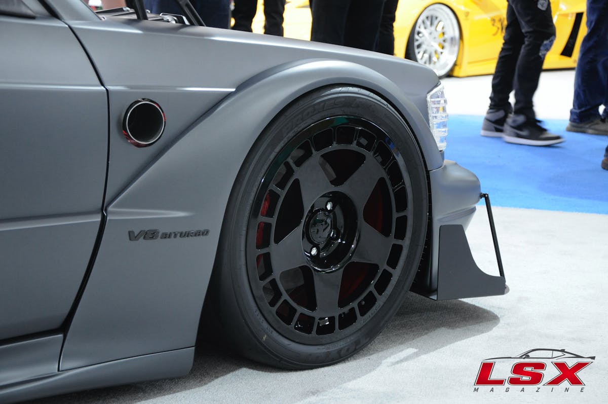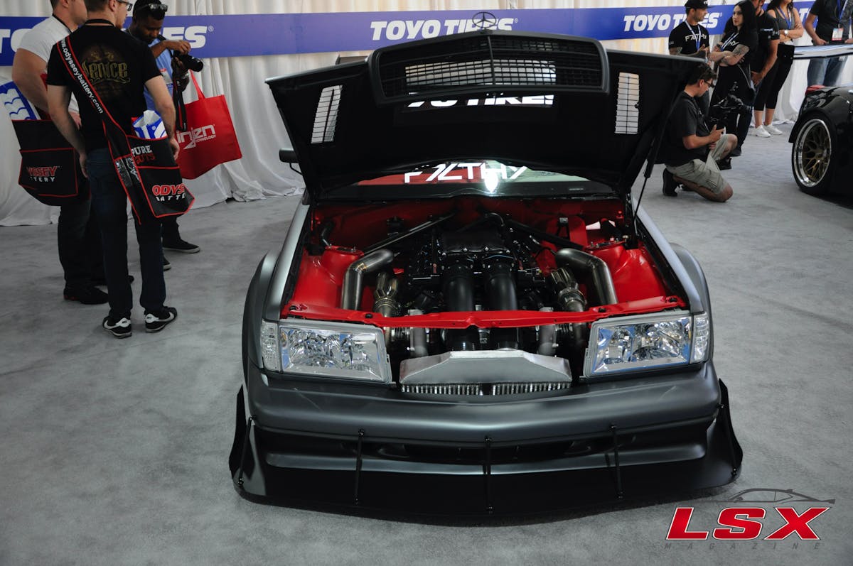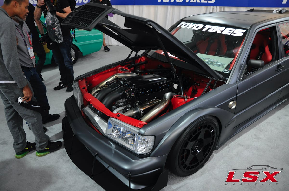 The car we spotted was a grey Mercedes that had obviously been LS swapped. But that was about all we could tell from the pictures other than the fact we could also see that it was in the TOYO tires display. After we walked what seemed to be miles, we finally made it to our destination and were greeted by the car’s owner and builder, Tim Lajambe.