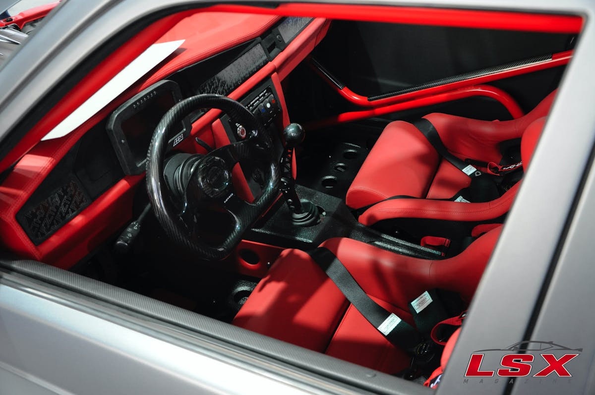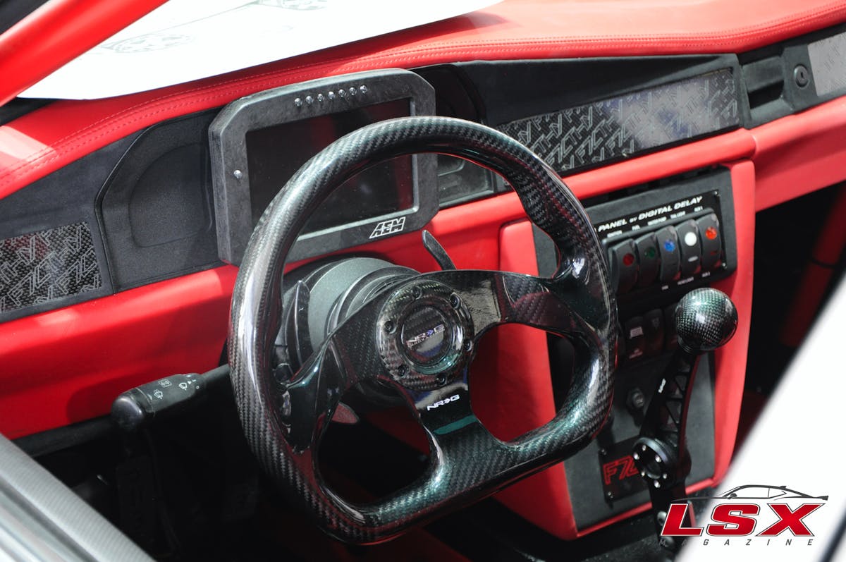 While a lot of attention to detail went into the body and under the hood, the interior was not neglected. The red and black theme continues on the inside of this killer ride and is a work of art. An AEM digital display shows the car’s vitals and looks right at home against the black suede. Even the shifter in the Mercedes is trick and made of billet and carbon fiber.