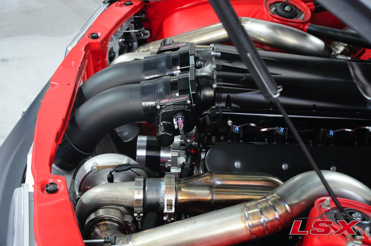 For the engine, A Texas Speed and Performace LS3 408 cubic-inch stroker was utilized in conjunction with a Late Model Engines (LME) intake with dual throttle bodies and twin Precision Turbos. On low boost, the combination makes 700 horsepower, but 1,000 is no problem when needed. When asked why he opted for an LS, Tim said, “I’m a big Mercedes fan and I was planning on putting a V12 in the car. The problem is, the power numbers I was trying to produce versus the cost of building, the V12 didn’t make sense. The LS is tough to beat when it comes to power and performance. My pockets aren’t bottomless, so the LS is perfect. I’ve pissed off a lot of people with this car, but by now, they are starting to get it. You see guys like Cleetus McFarland banging out 100 to 150 passes with no problem, and it’s very understandable of why the LS is so popular.”