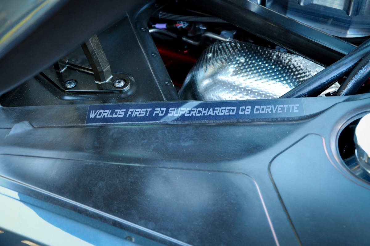 At the show, we connected with Boost District. The California-based company focuses on custom superchargers and turbochargers for GM vehicles. So naturally, it was only a matter of time before they decided to build a system for the C8, which fortunately for us was on display at the Magnaflow booth at SEMA. Roshan (GTO) Poptani, President of Boosted District, was there and gave us a first-hand look at the company’s C8 shop car, which they claim is the world’s first positive displacement (PD) supercharged Corvette. Roshan said, “We built the entire supercharger system for the C8, and the only thing that is off the shelf is the LT5 lid that we used for prototyping and the Eaton TVS R2650 rotor pack. Currently, we are building a billet lid for convertibles or for the coupe owners that want a custom lid.” And if it’s customizability you want, the company aims to please with a powder coating of the customers choice and one-off engraving.