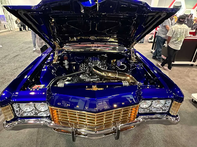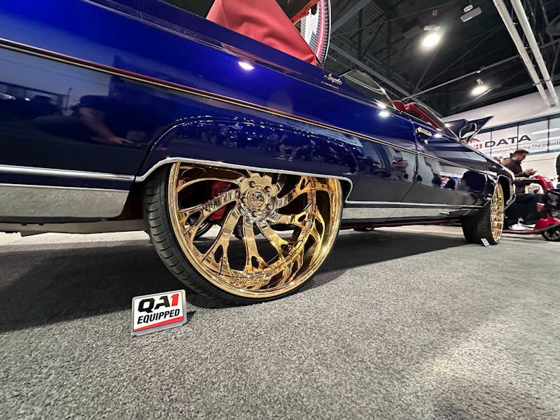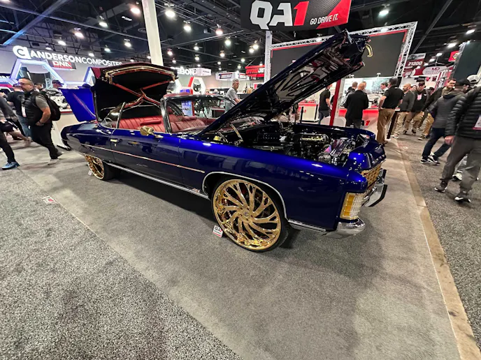 While walking the floor at SEMA, we were instantly drawn to this super-blue, LS-powered 1971 Chevy Impala drop-top in the QA1 booth. Those gold 26-inch wheels immersed in that sea of blue were more than enough to catch our eye. The fact it was a convertible only added to the cool factor.