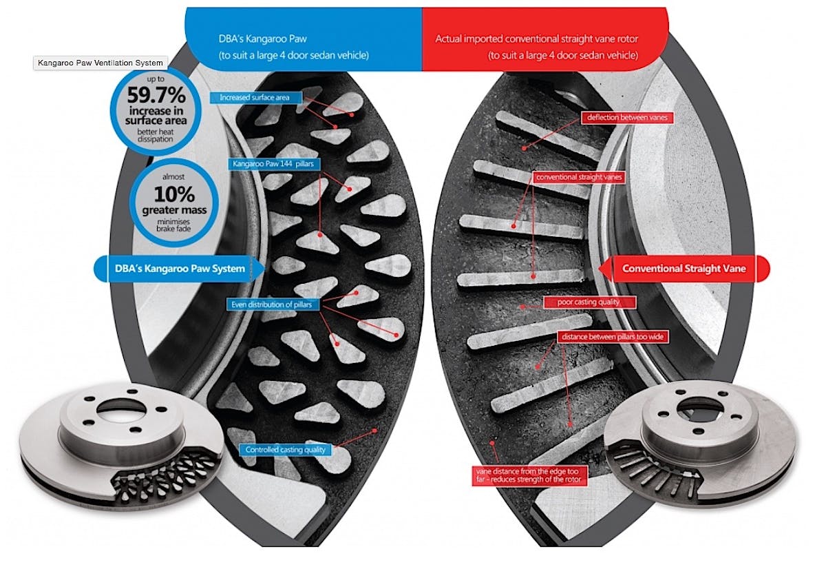 DBA’s wide range of performance disc rotors feature the patented Kangaroo Paw ventilation design, which is a major breakthrough in brake rotor technology. It helps increase disc rotor efficiency by up to 20 percent, compared to conventional disc rotor designs. Individually spaced between the rotor faces are 144 diamond and teardrop shaped pillars that provide greater strength and surface area to increase heat dissipation.