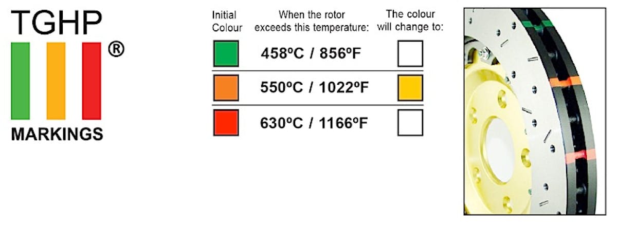 DBA’s disc rotors also incorporate Thermo-Graphic Temperature Monitoring (TGHP). What this means, Kellman stated, “Is that there are special paint markings that change color at specific temperature thresholds. This way the driver can easily monitor their braking performance by looking at the markings.”