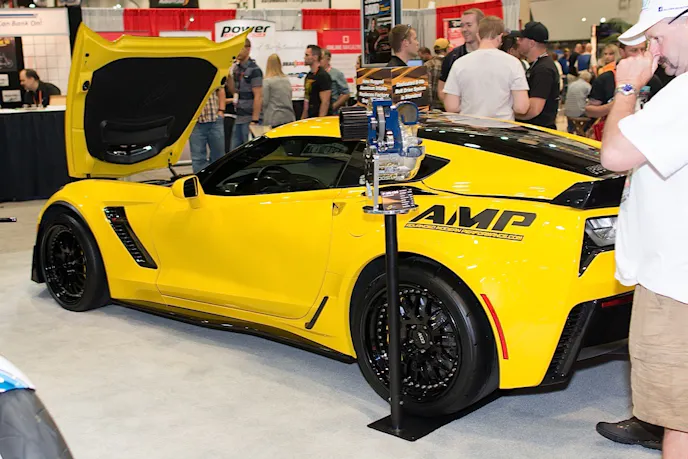 Next on the list was ProCharger’s ’15 C7 Z06 Corvette on display, which was built by Advanced Modern Performance out of Arlington, Texas. Because the C7 Z06 is rather new to the market, we asked Radzins how the company is able to achieve such high-horsepower numbers with this kit. He replied, “The factory supercharger is completely replaced. We provide a billet-aluminum intake manifold in place of the factory unit, which is fabricated in-house. Any supercharger we offer, from a P-1SC-1 to a F-1X, will work with this manifold and kit without any modifications required. This car uses a F-1X. On 22 psi of boost, we’re pushing 1,020 rear-wheel horsepower — and that’s on a 93 octane pump-gas tune. It’s the first C7 Z06 in the world to make those numbers on boost only.”
