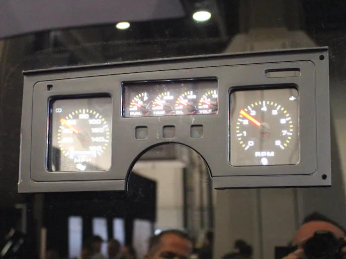 The gauge cluster comes with speedometer, tachometer, fuel gauge, voltmeter, oil pressure gauge, and water temperature gauge. There are also turn signal indicators and a high beam indicator, just like the originals. The cluster features automatic night-time dimming and also comes with a lifetime warranty, all necessary sending units, hardware, and instructions. The speedo reads up to 160 MPH, includes simple one-button calibration (regardless of tire size, gear ratio, or transmission), odometer, trip meter, high speed recall, 0-60 time, and ¼ mile elapsed time (ET). All with the push of a button!