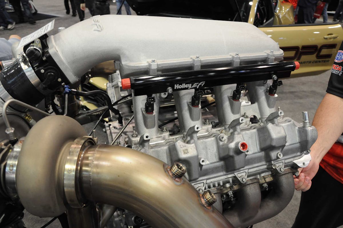 A forged, factory L8T crank and SDPC-prepped LT4 heads are held in place with ARP fasteners. The Holley EFI system controls the fuel.