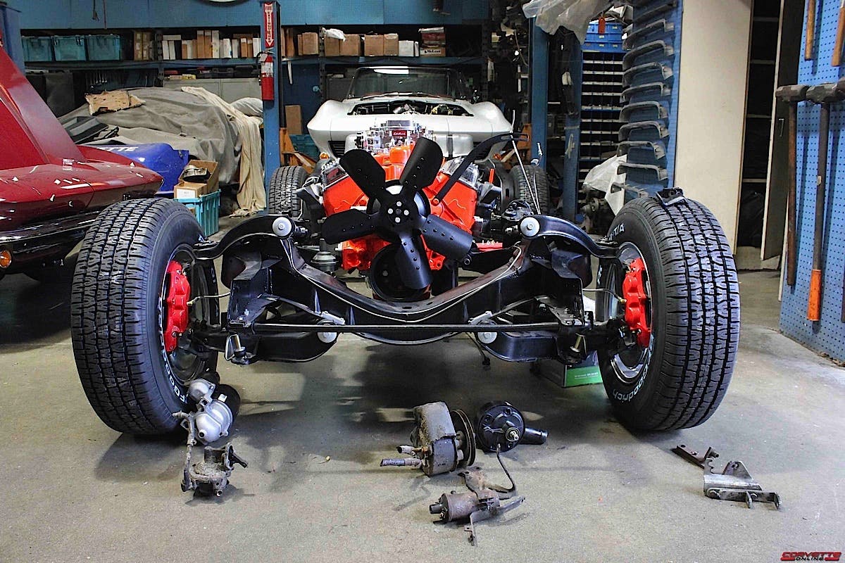 Further back was another C2, this one a ’64 coupe that would be used as a daily driver. The body and frame rested front to back from each other, with the frame all kitted out with a B&M 700R4 transmission, 327 ci V8, Bilstein shock absorbers, Wilwood disc brakes, and other such upgrades.