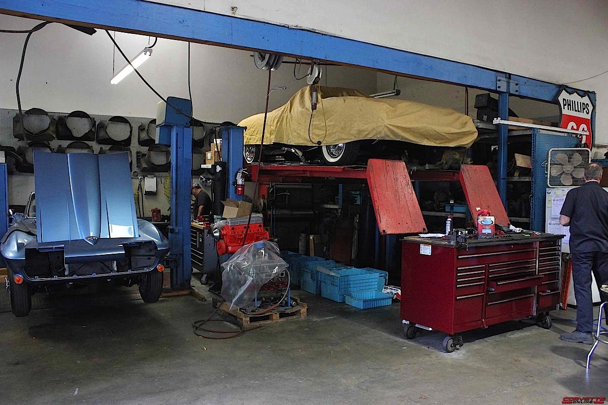 Across the way, a C1 sat hoisted on a lift next to yet another C2. The C1 had gotten its frame thoroughly cleaned and body painted, while the C2 was the less-than-great result of another shop’s work (see above interview) that had to be gone over once again to achieve perfection.