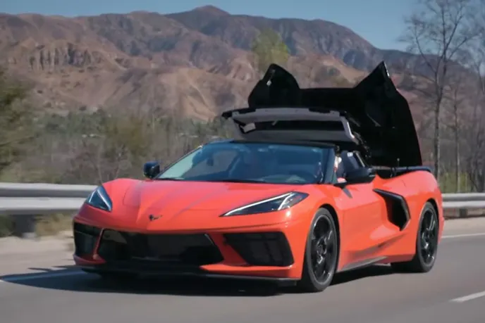Jay and Tadge enjoy a drive around in the new C8 convertible. Jay is the first person outside of GM to drive the all-new car.