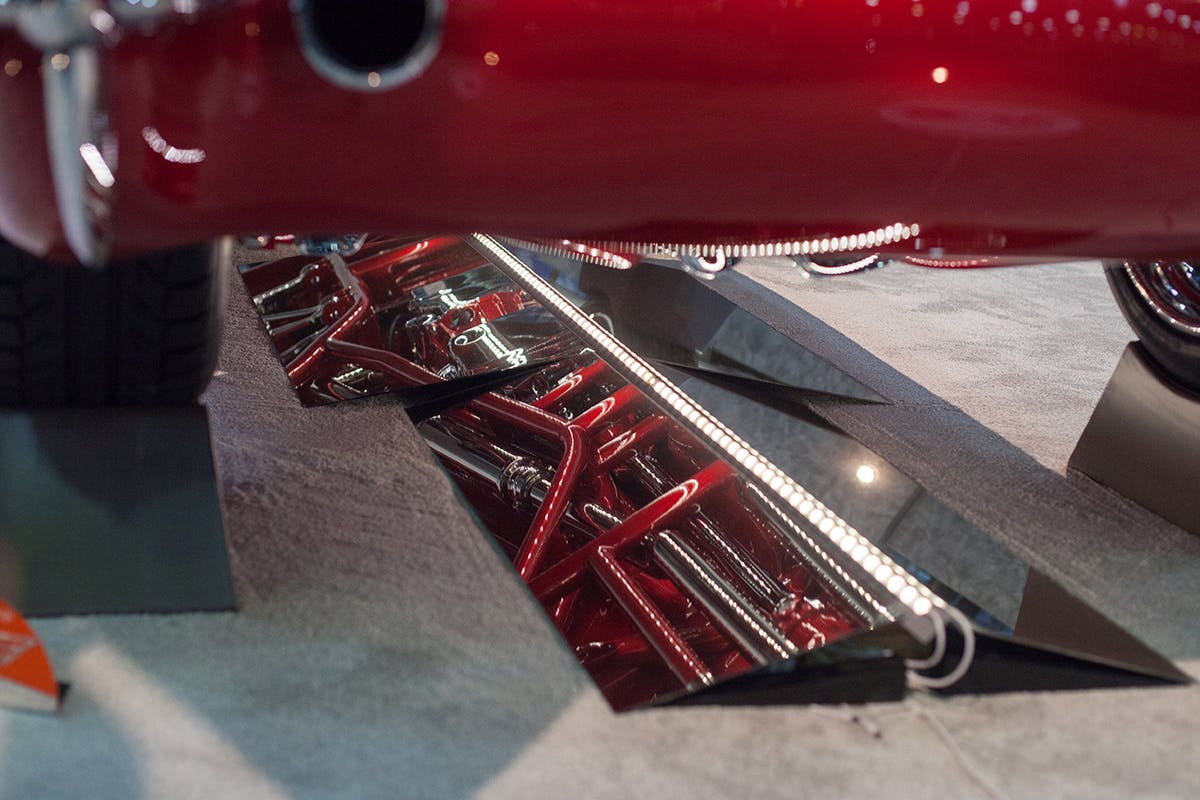 Additionally the rear wheel wells were moved inward and the quarters extended three quarters of an inch to accept the 18×8 by 20×10 Billet Specialties Knuckle wheels.