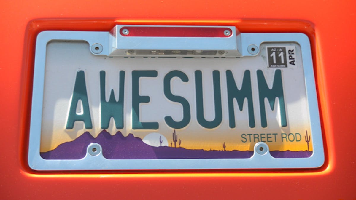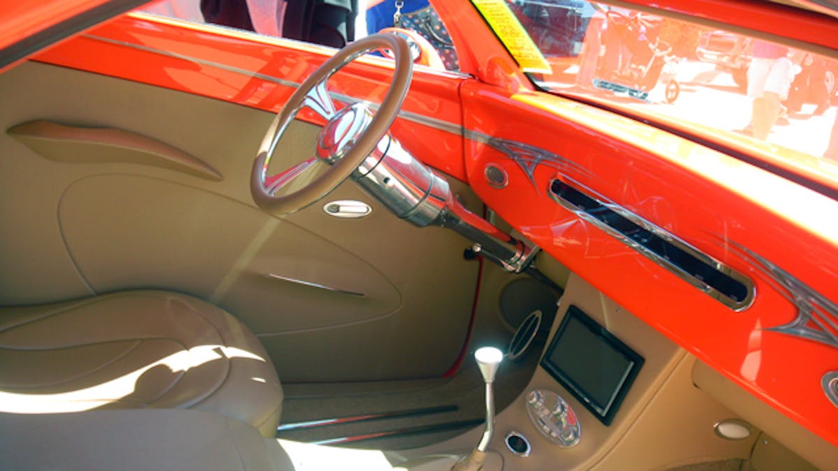 The Orange Smoothie is a color that Bingham claims is a love it or hate it hue appropriately dubbed Ultra Orange by House of Kolor. The graphics were added to already wild color, by Mike “Wet” Willy of Claremore, Oklahoma. After completing the build the Orange Smoothie was selected to be a calendar car for the House of Kolor 2008 edition calendar and was also featured in the ’07 issue of Street Rod Builder. Interior-wise Bingham elected to go for classic tan leather upholstery by James Carter at Bitchin Stichin in Tonitown, Arkansas. Topping off the plush interior of the car is a 500-watt audio and video system that keeps Bingham and his wife Diana entertained while cruising the Smoothie.