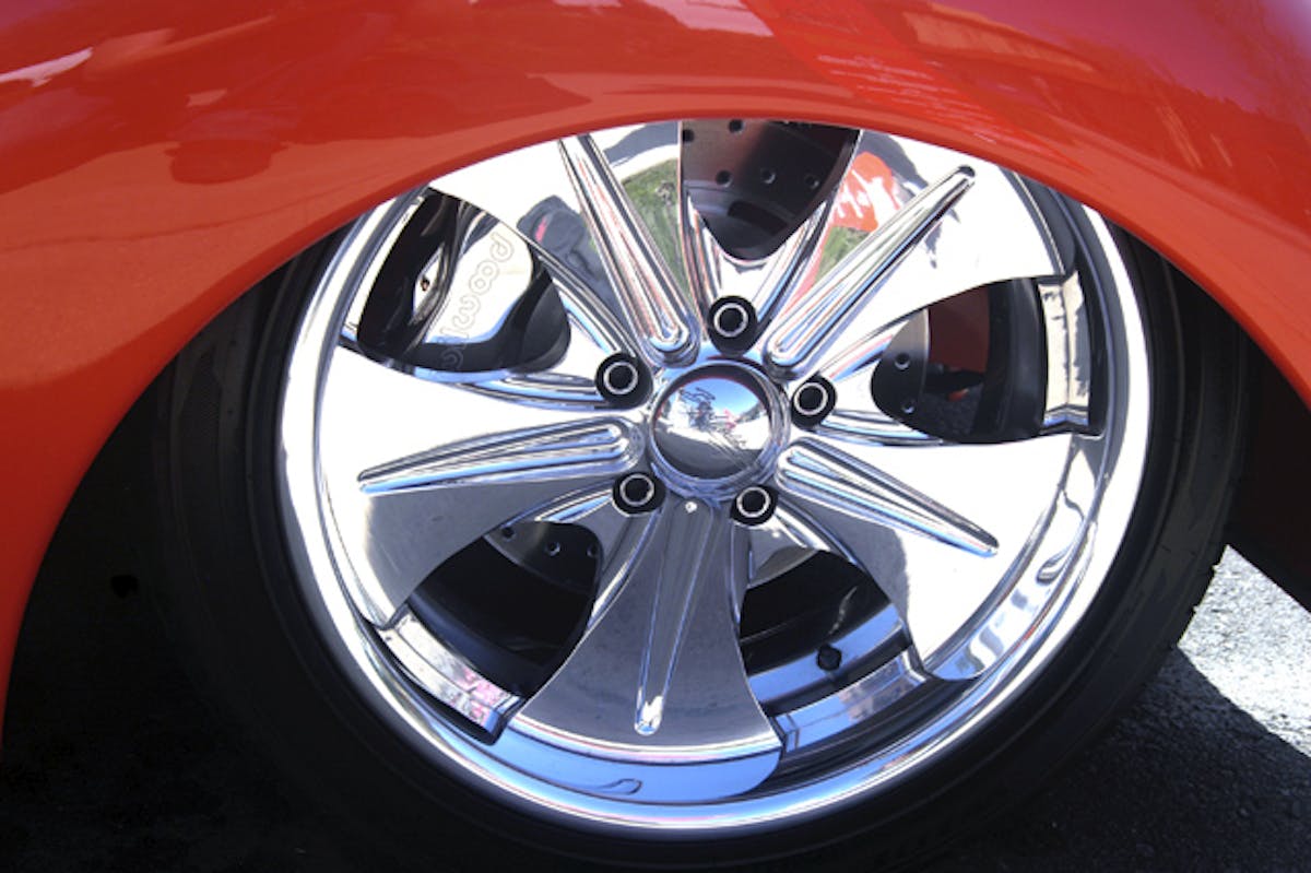 A set of Boyd Coddington wheels was chosen for this GM-powered Ford roadster. In the front the 17” billet wheels are wrapped in Firehawk wide oval 215/45/17 while the 20” rear wheels are covered with 295/40/20” rubber. Wilwood 14”cross-drilled zinc plated rotors with 4-piston chrome calipers add additional flash to the blinding refection of the highly polished billet rims. According to Bingham the Orange Smoothie sits on a boxed/tube chassis. A Mustang II tubular Air Ride front suspension with 2” drop spindles sets the stance for the front end; the Smoothie definitely tucks tire in the front. Like the front the rear suspension, the rear is handled by a 4-link Air Ride set up. It may sound like a laundry list of components, but the stance on Bingham’s roadster is a thing of beauty.