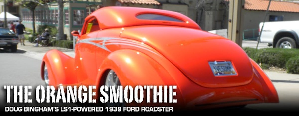 Temecula is known for its wineries and the hot air balloon festival, but twice a year the streets of old town are packed with approximately 500 hot rods of all makes and models. A dizzying array of vibrant paint schemes, chrome and billet overwhelm the senses, but occasionally a car stands out from the masses beckoning a second, third or tenth look. Parked along a side street was just such a machine with its eye piercing orange paint job. It is hard to miss a bright orange ’39 Ford Roadster with more bling than a hip hop artist. After spending a considerable amount of time drooling over the ’39, a gentleman introduced himself as the owner of the car appropriately named the Orange Smoothie. Doug Bingham of Yuma, Arizona is the proud owner of this ridiculously sweet rod.