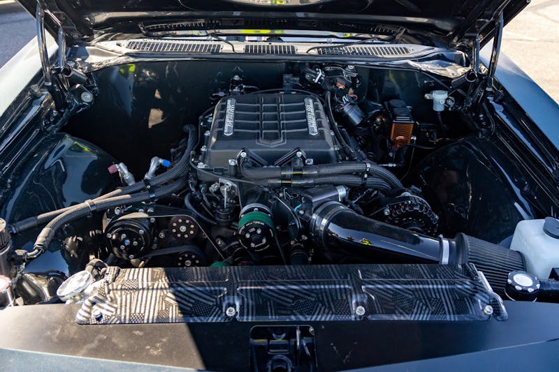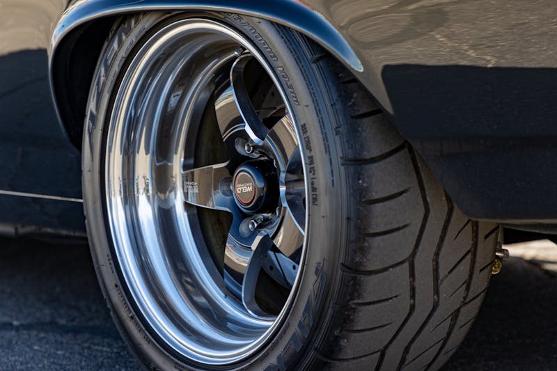 This ’69 Chevelle rolls on Weld Ventura wheels, finished in black and sized just right to fill the wheel wells without looking cartoonish. Up front, 18×8.5-inch wheels are wrapped in 235/40/18 Falken tires. In the rear, 18x10s hold a meaty 295/40/18 tire, giving the car plenty of grip to harness the supercharged torque.