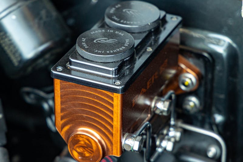 Hauling it all down is a full Baer brake setup finished in Arizona Copper, which plays well with the car’s dark metallic paint. Up front, 13-inch Pro+ rotors are clamped by 6-piston calipers, while the rear features Baer’s SS4+ kit. A matching Remaster master cylinder ties the system together for consistent pedal feel and solid stopping power.