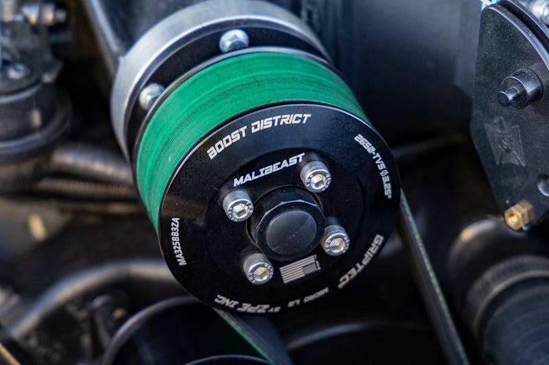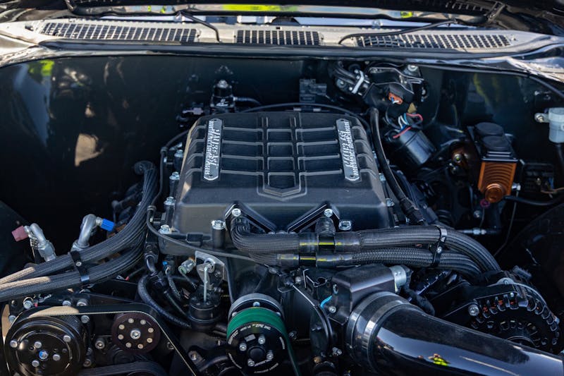 Sitting on top of it all is a Boost District 2650 supercharger, an Eaton-based unit known for its consistent power delivery and OEM-like reliability. Dan added a custom supercharger badge machined by Evans CNC, giving a personal touch to the high-powered setup.