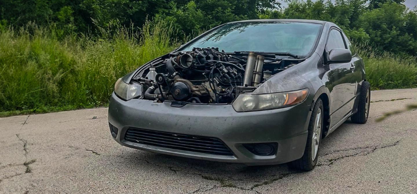 To pull off this project, Matson did what many of us would like to do and simply invited several friends over to help him perform the conversion and complete the build in only a few weekends. While talking to Matson about his creation, he had this to say, “It’s a 2006 Honda Civic LX that originally had a 1.8-liter engine and five-speed manual transmission with 208,000 miles on it. I obtained the car from a kid I knew in high school. He was going to send it to the junkyard because the motor was knocking, so I ended up buying it from him for $500 in November of 2022 and drove it for about a month. I actually drove the car into my garage on the 18th of December. I had to decide whether I wanted to fix it and boost it for fun or do something else. I’ve done a handful of other projects, and I just so happened to have a 4.8-liter Gen 3 LS laying in the corner of my garage and a spare 4L60E with a complete wiring harness. So I did my research in seeing if anyone else had done it, and to my surprise, I could not find anything on anyone LS swapping an eighth-generation Honda Civic.”