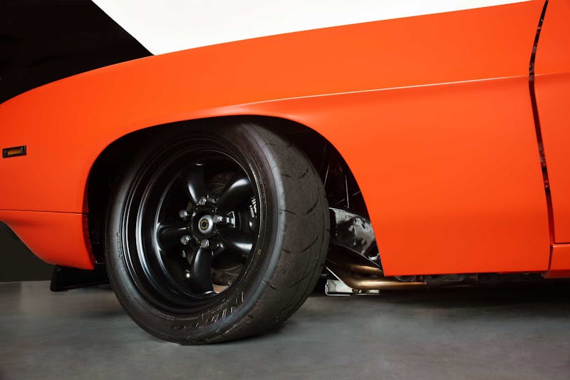 But Psycho is more than just a potent mill and a long list of deleted goods. There’s a full complement of Global West tubular control arms up front with Carrera coilovers keeping the ride height. A set of Del-A-Lum bushings let the front arms and rear springs move without any unwanted side action. A set of PRO rear shocks keep things stable in the rear and a 1 ¼-inch front and ¾-inch rear sway bar keep the headlights and taillights parallel to the horizon in the turns. To help in making those turns, a manual 1966 Corvette worm-and-sector steering box tells those massive Nitto NT01, 245-40-17 tires which way to go. Out back, a set of 315-sized Nitto tires wrap around a set of American Racing Torque Thrust II wheels. Wilwood provides the whoa-factor whenever necessary and that narrowed 9-inch featuring an Auburn Tru-Track limited-slip diff and 4.33 gears provide the go when the tall, skinny pedal gets mashed.