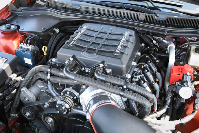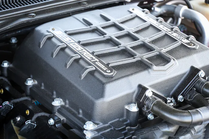 Of course, a BoostDistrict Gen-II 2650 supercharger sits atop all that performance goodness, and thanks to a 3-inch upper pulley driven by the crankshaft’s 9.1-inch lower unit, the TVS2650 head unit pumps 18-19 psi into the engine. In addition, a Katech 112 mm throttle body ensures no restriction when the butterfly goes WOT.