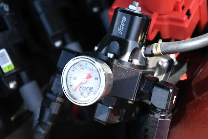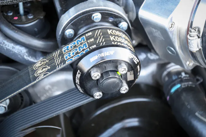Of course, a BoostDistrict Gen-II 2650 supercharger sits atop all that performance goodness, and thanks to a 3-inch upper pulley driven by the crankshaft’s 9.1-inch lower unit, the TVS2650 head unit pumps 18-19 psi into the engine. In addition, a Katech 112 mm throttle body ensures no restriction when the butterfly goes WOT.