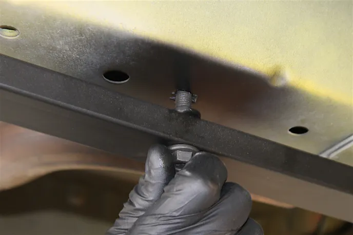 During the mock-up process, we found that there wasn’t a nut in the rocker panel where we needed to secure the frame connectors completely, so we carefully welded one nut nut in each side to receive the bolts. With the nuts welded in place, we hand-tightened the frame connectors and moved on to fitting the front cross-brace. Using a jack stand, we held the crossbrace in place, and began installing it with the supplied bolts.