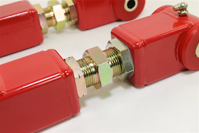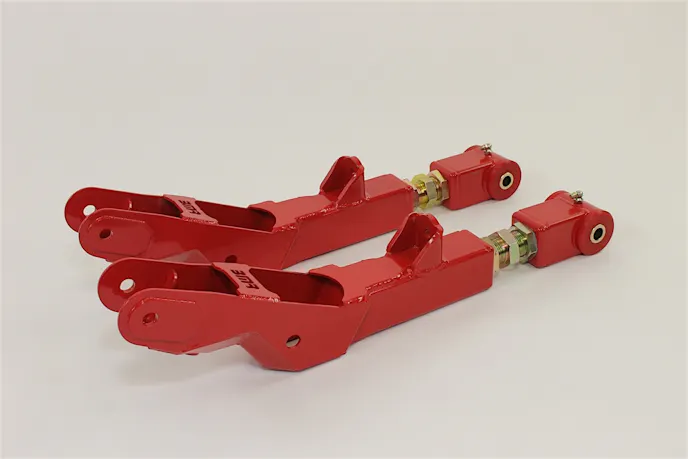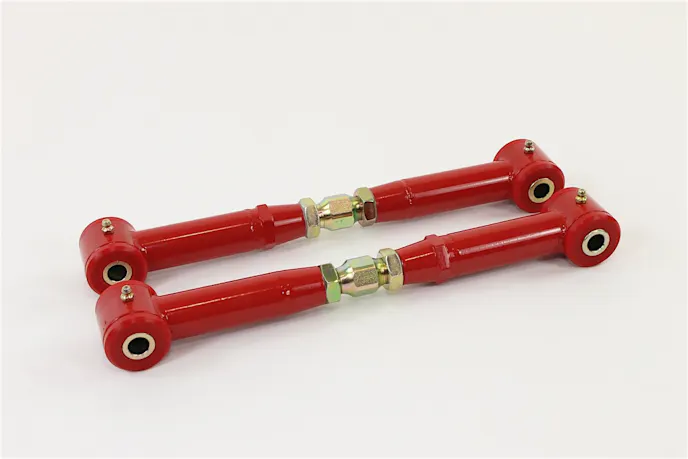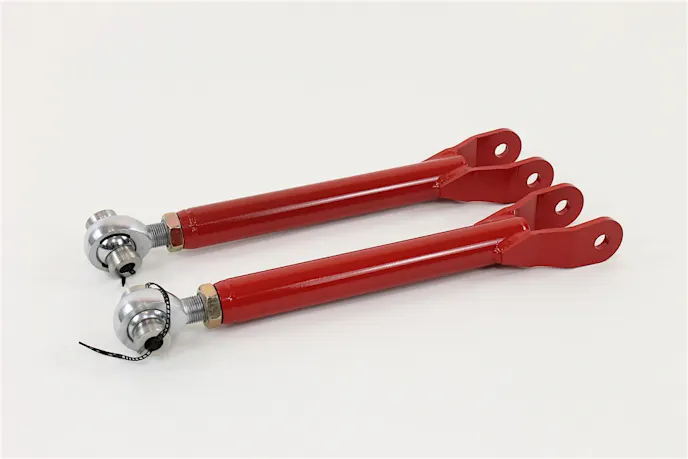 The factory toe rods on the fifth-gen Camaro are made from flimsy stamped steel and use soft rubber bushings on the mounting points. Their duty is to keep the rear wheels in a fixed position, not pointing inward our outward under load. Deflection of these toe rods can cause poor launch stability, decreased braking ability, and inconsistent handling. BMR’s toe rods (P/N TR003) are made from 1.25-inch heavy-duty DOM tubing, use polyurethane bushings on the mounting points, and are double adjustable, meaning you don’t have to take them off of the car to adjust.