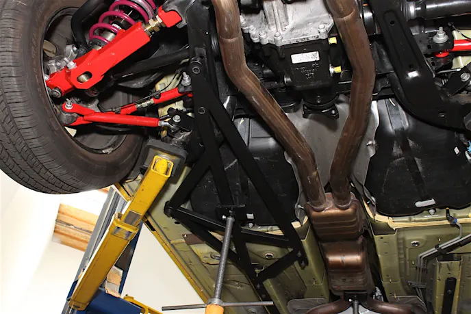 Once we had a jack stand supporting the cat-back section of the exhaust, we removed the tunnel brace so we could fit the rear sections of LG’s chassis bracing kit. Using two more jack stands, we mocked up the rear sections in place, then bolted them to the chassis and rear subframe, leaving them hand-tight. When installing the rear sections, there are plate nuts that need to be inserted into the chassis to receive the bolt that secures the outermost part of the rear sections. There are openings in the chassis where they slide in, and even a tab to keep them in place while tightening the bolt.