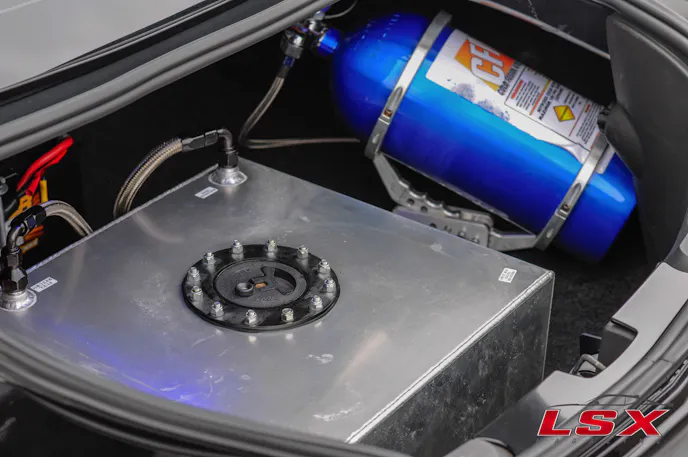 The Camaro has its share of power adders, including a nitrous system and a pair of turbos. The nitrous system is a Cold Fusion single nozzle unit that is jetted at 75 horsepower to the get the Camaro rolling off the line. It also acts as a liquid intercooler as it drops the air intake temperatures when activated.