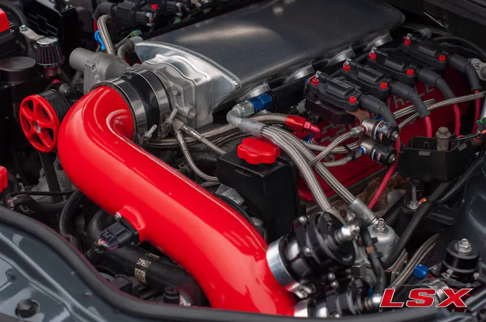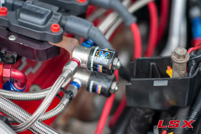 Larry decided to stick with the stock ECU for now. The engine gets its fuel from a set of 1650cc Fuel Injector Clinic (FIC) injectors, two Fuelab HE series fuel pumps, and a Weldon Racing fuel pressure regulator set a 55 psi.