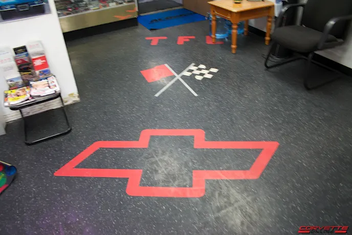 We drove down for a visit in December of 2014, and were met with several kind smiles. The front of the shop houses a customer waiting area which is absolutely filled with racing and Corvette memorabilia collected over the years by owner and president Lawton Ferreira. Ranging from drag racing trophies and pictures of his own Corvettes as a young man to a case of Hot Wheels and speed or oil-related collectibles, it’s quite a sight. The room is also brought together by the custom flooring tiles sporting the “TFC” rider above Corvette and Chevrolet emblems.