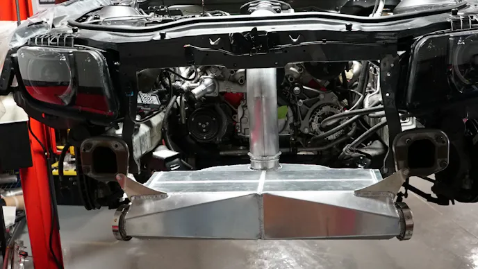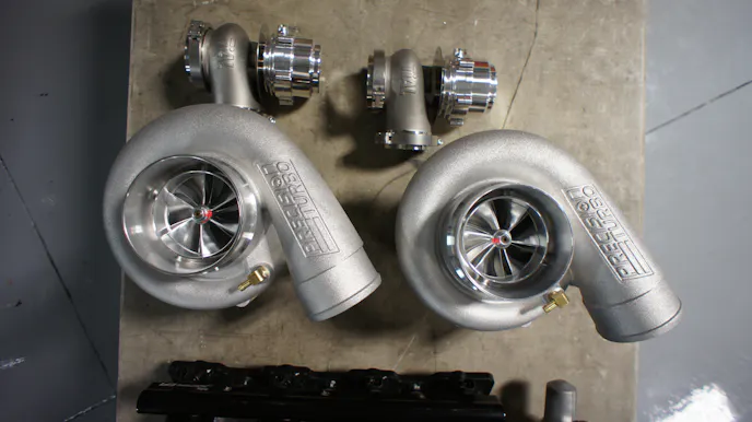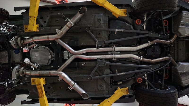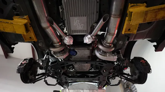 Vengence Racing was responsible for every inch of this killer build. Sitting on top of the Mast Mororsports heads is a billet Late Model Engines (LME) intake connected to not one, but two Precision Turbo 76/75 turbochargers. Vengence took care of the complete custom turbo system and fabricated everything to perfection from scratch. This includes a custom the air-to-water intercooler, exhaust manifolds, turbo hot and cold side, and a custom exhaust system complete with cutouts. After the fabrication precess was complete, the hot and cold side were both sent to powder-coating before being reinstalled.