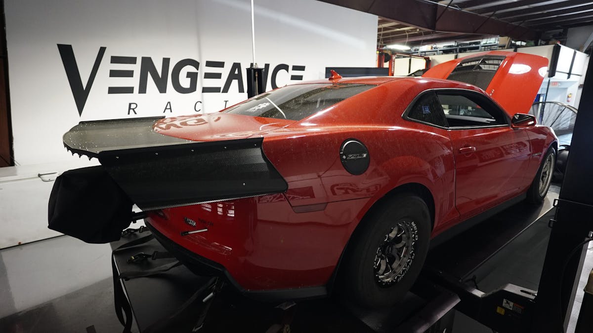 Getting fuel for all the air is done mechanically through a MagnaFuel 4103 fuel pump and regulator, which feeds the Fuel Injector Clinic’s 2650cc injectors. Vengeance Racing’s Jey Clegg tuned the Pro EFI 112 ECU for a balanced diet of fuel and air under all operating conditions.