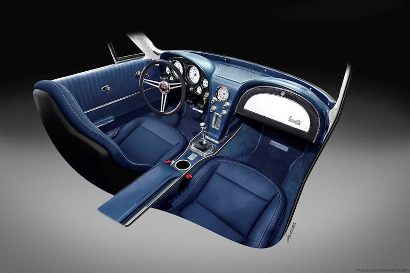 Emblems are a great way to make a statement on an all-white exterior, but Kevin didn’t want to shout to get his point across. Keen eyes will note the differences between these emblems from stock, but the changes could easily go unnoticed, a tribute to their subtlety and craftsmanship. Kevin had Andrea Koenig of Motorhead Jewelry in Louisville, Kentucky, make C2-looking emblems with the factory C2-styled “Corvette” combined with a one-word “Stingray” in the C7 font. The side emblems are the original C2 design for a fuel-injected Corvette with the Fuelie tagline swapped out to “Supercharged” in the C7 style. One final design element that could easily go unnoticed includes the custom Classic Instruments gauges combining the C2 Corvette crossed flags and numbers in the C7 Corvette’s font.