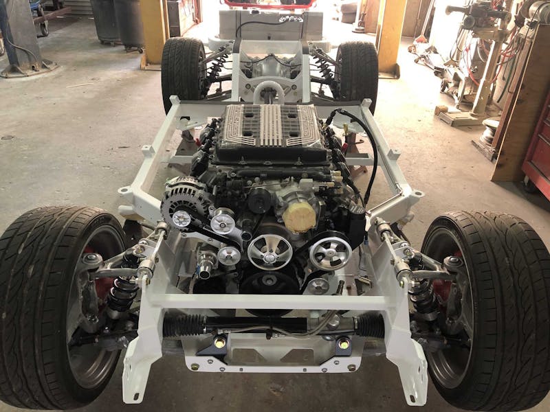 Bridging the gap between generations was mainly the work of Tim and the team at J&M. After the body and chassis was fitted properly, the car was disassembled for the last time so everything could be coated in the appropriate color for the build. The body and frame received their shiny white hue, while the engine compartment received a contrasting color that matched the interior. After the appropriate cutting and buffing, all the components were installed for the last time.