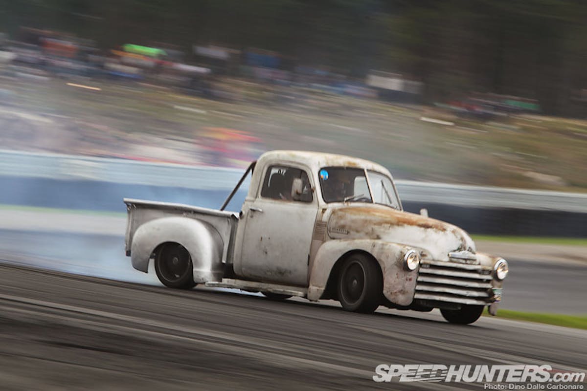 What you see before you is reportedly a 1949 Chevy pickup (…that looks its age…) that has had a C5 suspension and driveline grafted under its 60-plus year old body, including a stock LS1 power plant up front. It looks great for scaring the neighborhood kids, but isn’t good for much else since they bed was removed to fit the Corvette’s rear-mounted transaxle. Not all that strange to you yet? LS1 swaps and custom C5 based suspension have been around for years now, right? Well, what if we told you this farm truck from hell was set up for drifting of all things?