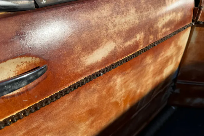 This is where things get interesting. The firewall is pieced together from old license plates. That alone would be enough to earn some attention at a car show, but the Callahans didn’t stop there. Look a little closer, and you will notice the pinstripe running along the body. That’s not paint. That appears to be a timing chain, repurposed and laid out along the car as a stripe.
