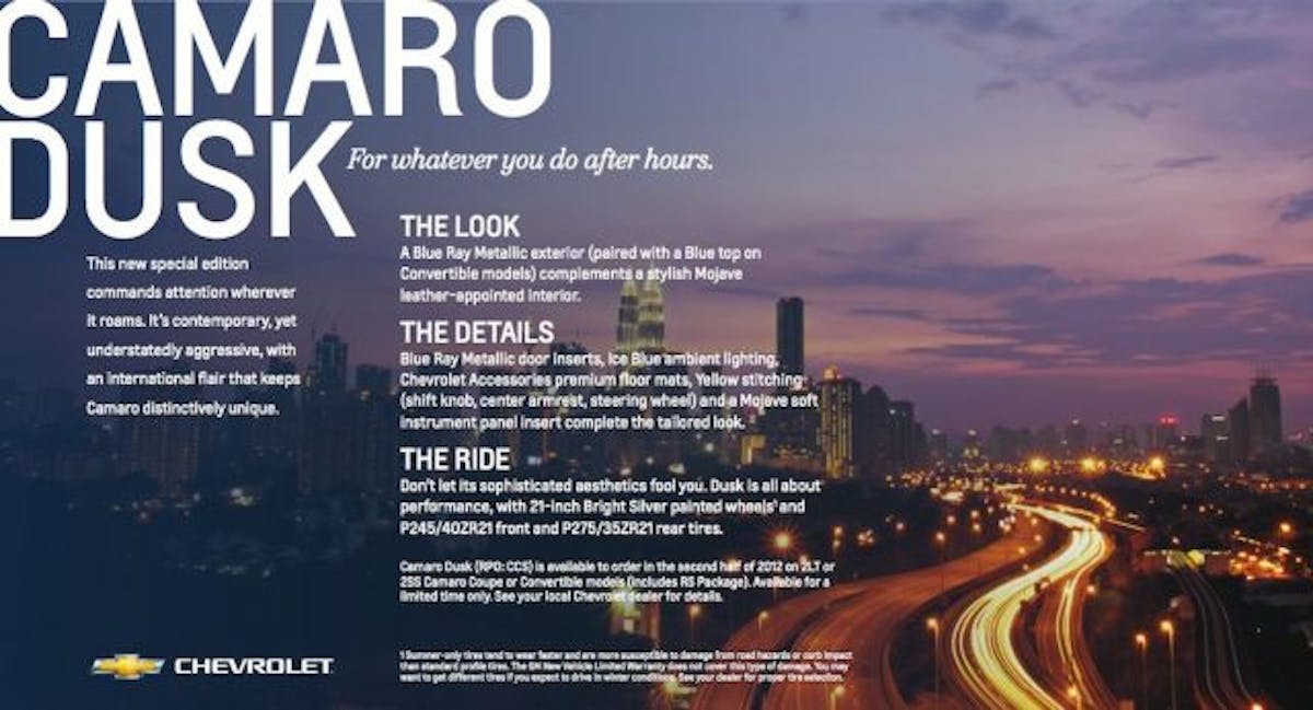 another exterior enhancement package reports Camaro5.com. Not that that’s a bad thing. In fact, in the case of the Dusk Edition Camaro, it is a very, very good thing.