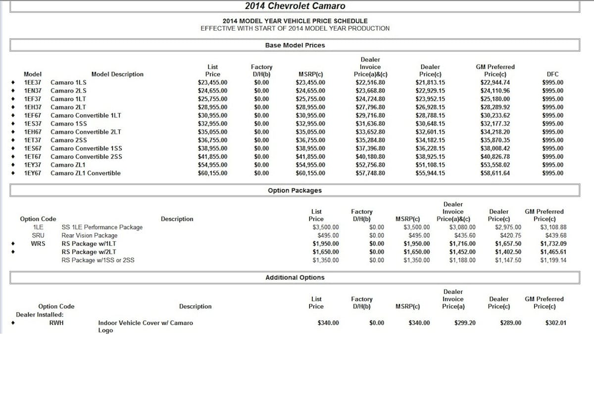 GM has rolled out the 2014 Chevy Camaro pricing sheet, which Camaro5 posted for all of us to enjoy. The MSRP of the Camaro has grown by a few hundred bucks per model, and new options, like the Recaro Racing seats, have also been added for 2014. Ladies and gents, time to bust out those calculators.