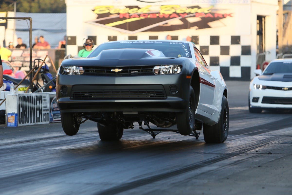Today was a tough day for Nitro-Gear Drag Radial cars. Anthony Manna’s turbo Camaro clicked off a 5.3 with tire shake, after breaking a control arm bolt on the previous pass. In the last pass on the evening, he ran against John Schaeffer’s ProCharged Camaro. Schaeffer went 5.06 at 144 mph as he continues to dial in the Camaro after switching from nitrous. Andy Essary in the twin turbo Trans Am and Paul Falcon in the turbo Formula also look to give these guys a run for their money. It’s anyone’s race at this point.