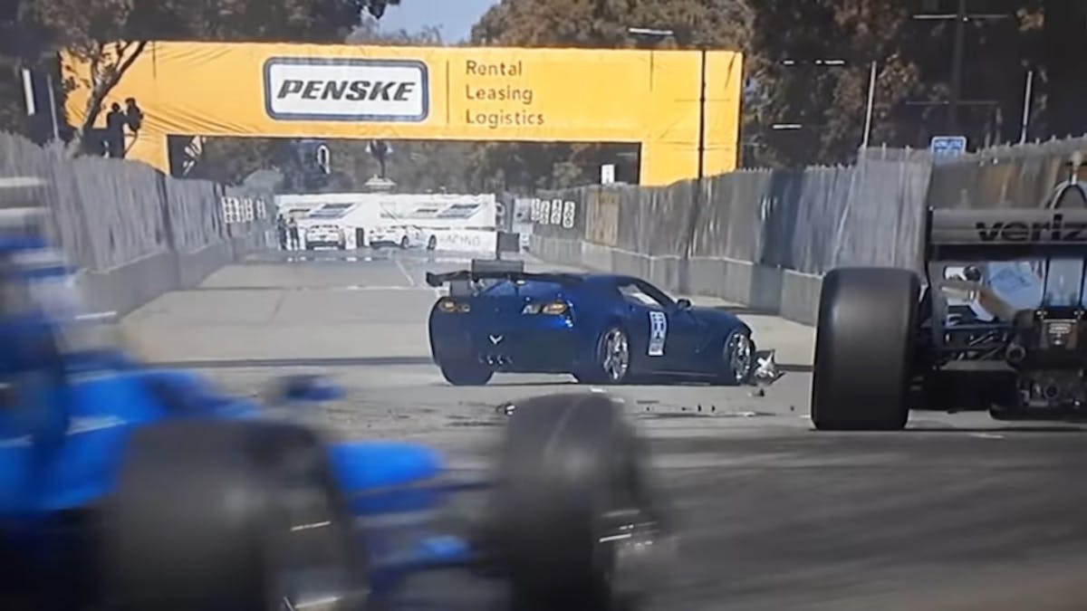 Mark entered the turn under power and the back end continued to carry the same arc. The car hit the wall and rested with a field of drivers sitting behind it. The race was delayed for about 27 minutes while the front of the ZR1 could be swept up.