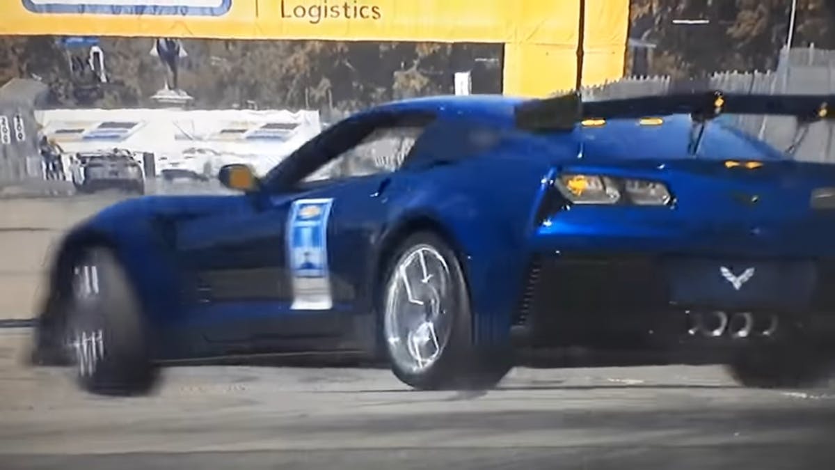 Mark entered the turn under power and the back end continued to carry the same arc. The car hit the wall and rested with a field of drivers sitting behind it. The race was delayed for about 27 minutes while the front of the ZR1 could be swept up.
