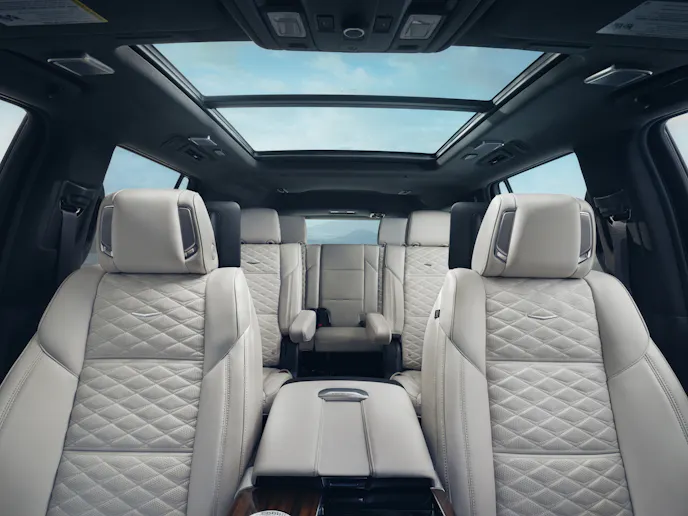 The rear seats can be folded down to increase the cargo capacity further, providing flexibility for various needs. Additionally, the Escalade-V has multiple convenience features, including a hands-free liftgate, keyless entry, and remote start, making it easy to use in everyday situations.