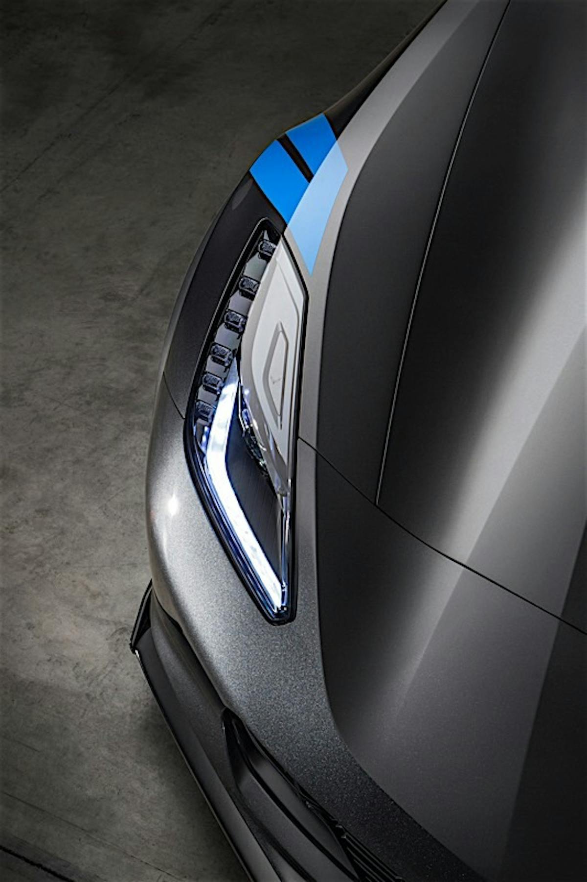A portion of the vehicles’ interior is suede-wrapped black, but majority features leather in the same eye-popping Tension Blue color as the exterior’s hash marks– quite a contrast. A 3D outline of the original Grand Sport racecar can be spotted on the front seats’ headrests and the instrument panel, along with a unique build number showcasing the specific vehicles collectibility.