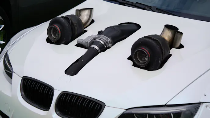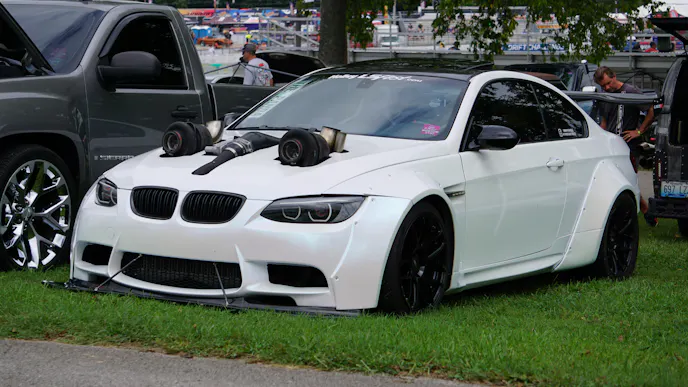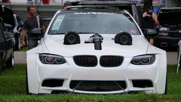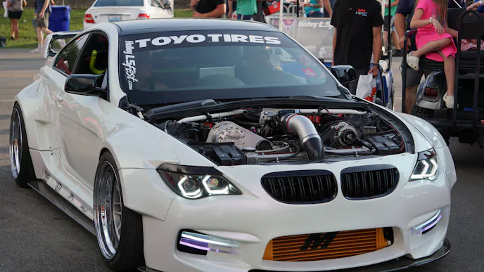 This 335i features a twin-turbo 408 cubic-inch LS engine backed by a T56 manual transmission. The 408 is specifically built with low compression to handle high amounts of boost. If I asked you to guess what sort of boost numbers this combination is making, you probably wouldn’t guess 31 psi. Originally built for drifting, this 335i is prepared to go fast and shred tires with its 1,000-plus horsepower on tap.