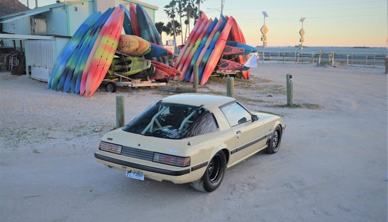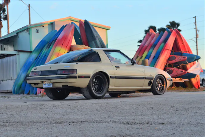 At first glance, this beige Mazda looks like a stock 1985 model with nice wheels and larger rear tires. Other than the exhaust pipe exiting through the right front fender, you might not give it a second thought. However, this turbo LS-swapped RX-7 is heavily pro-street inspired under its mostly factory-appearing exterior.
