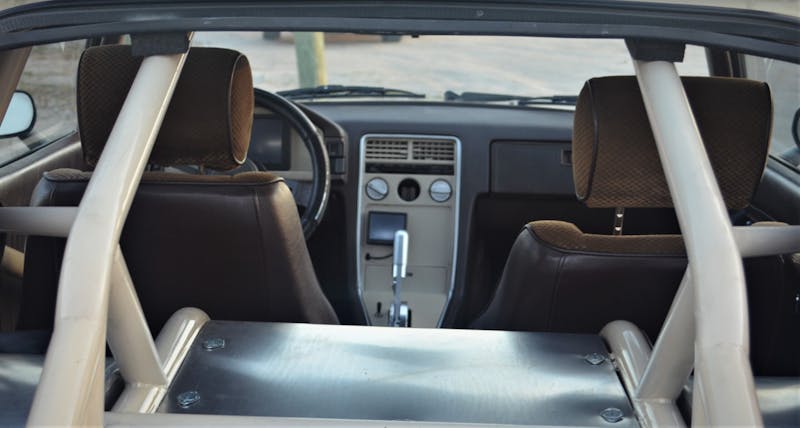 While the front suspension is mostly stock Mazda with minor modifications, the back half of the car is custom, with the bulk of the work done by Doug Carty Race Cars in Seminole, FL. The rear suspension is a custom-built four-link system with a Strange Engineering 3.73 rear spool, Strange 35-spline axles, and QA1 shocks.