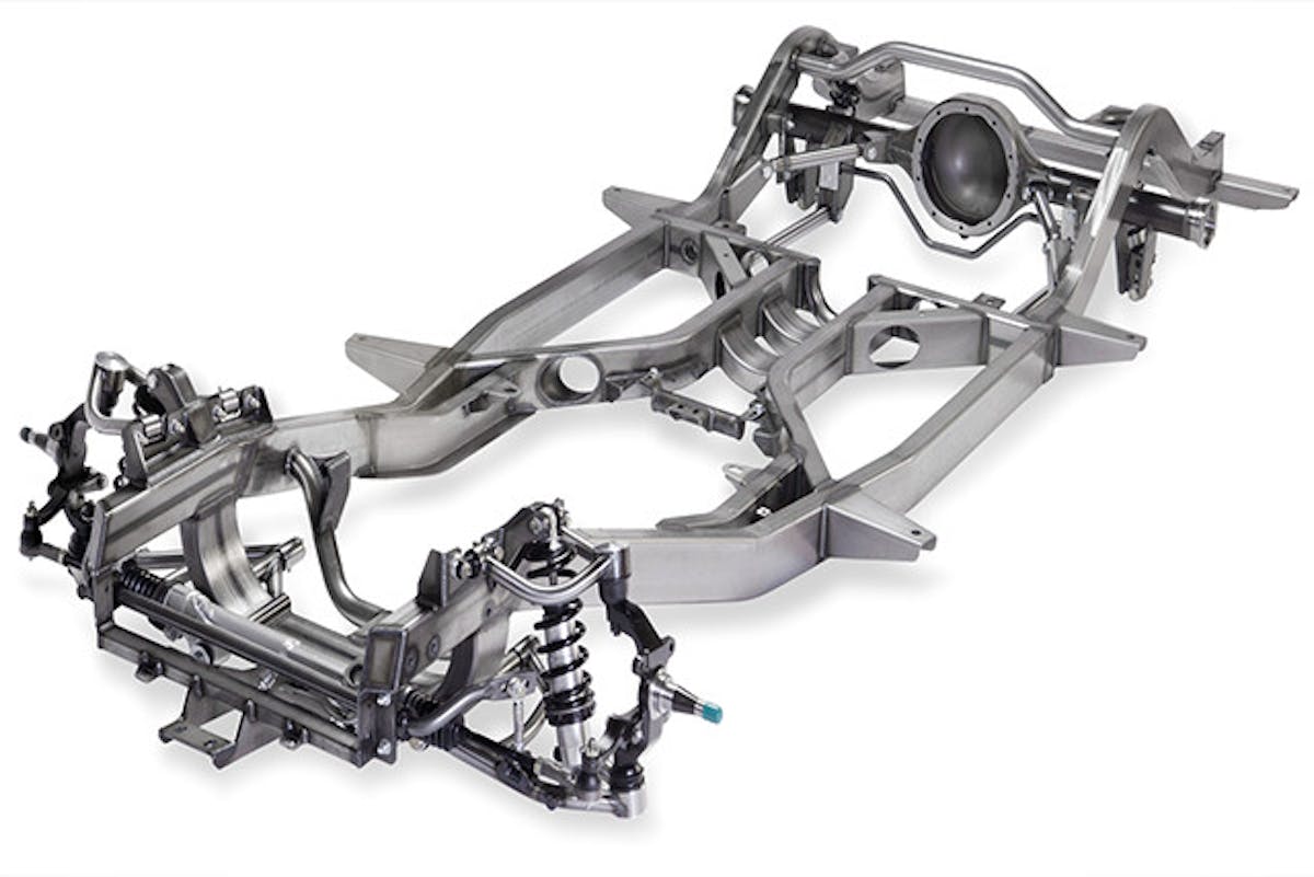 A unique crossmember stiffens the chassis for improved handling, and companion mounts can accommodate virtually any automatic or standard shift transmission, as well as small block Chevy or LS powerplants.