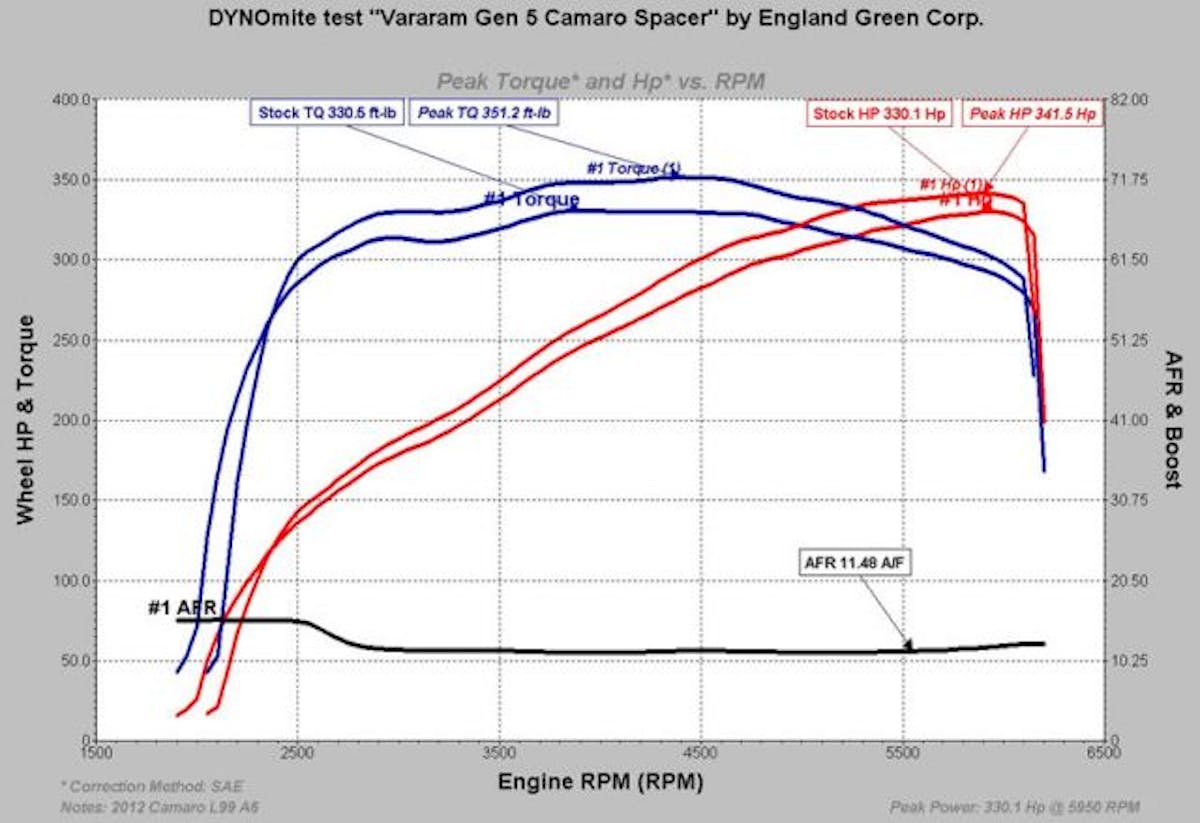 The VR Power Wedge changes angle of the throttle body so that the throttle blade is flat at WOT, and a variable radius air-horn and balance plenum help manifold vacuum move with less turbulence. So far, Vararam’s dyno testing of stock LS3 Camaros and Corvettes have shown gains of between 8 and 12 horsepower and pound feet of torque right in the meat of the power curve from 2500 RPM to 4500 RPM. Not bad for about 10 minutes of work.