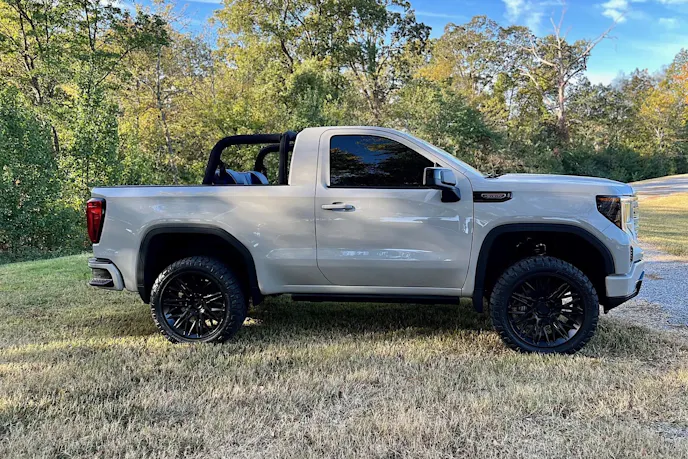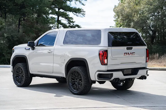 One of the great things about the Flat Out Autos Jimmy conversion is that all of the factory powertrain and electronics remain intact and functional. The tailgate is the electronic MultiPro version that includes a backup camera, electric lock, and a hands-free opening feature. The factory GMC interior options remain, including heated and cooled front seats and a touchscreen infotainment system with Apple Carplay and Android Auto connectivity. According to the auction ad, the center console was upgraded to a unit from a GMC Denali that features a wireless cell phone charger and USB ports. Powering this Jimmy is the stock 5.3-liter V8 that sounds better thanks to a Vance & Hines cat-back exhaust system. The factory 10-speed automatic transmission sends power through a dual-range transfer case and a shortened drive shaft to the stock rearend.