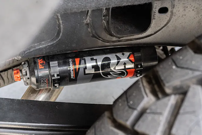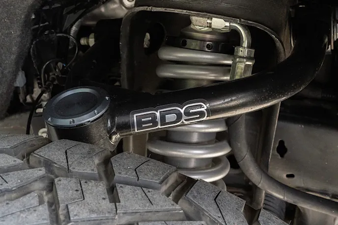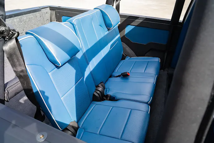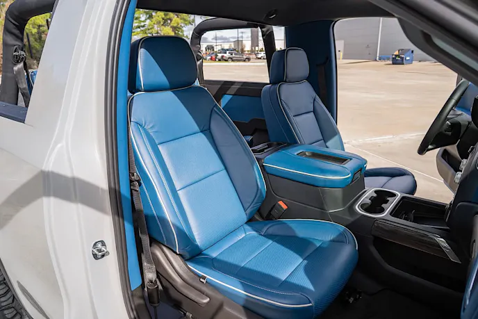 To further customize this Jimmy, a roll bar was installed and the interior was reupholstered in blue leather with white piping with matching color-coordinated accents on the dash, center console, door panels, and side panels. The exterior is finished in Porsche Chalk Gray with custom Jimmy badges. The suspension was upgraded with front upper control arms from BDS and Fox shocks in the front and rear. This Jimmy rolls on black-finished 22-inch Rotiform wheels wrapped in 285/50R22 Nitto Ridge Grappler tires.